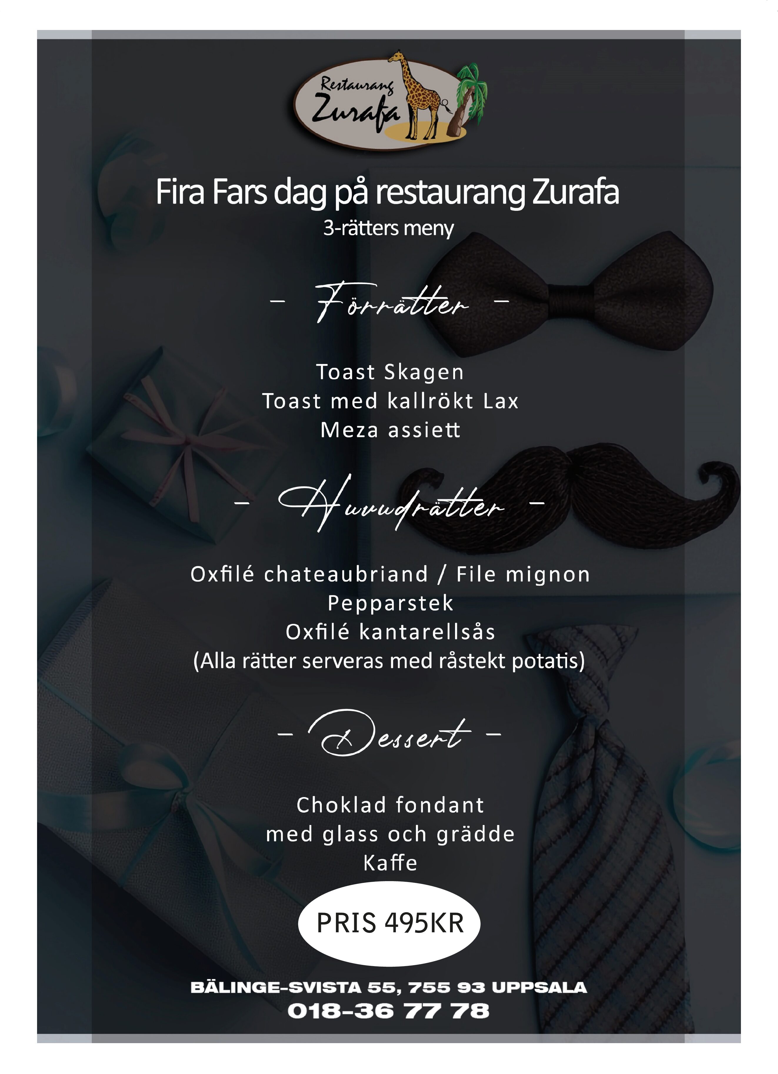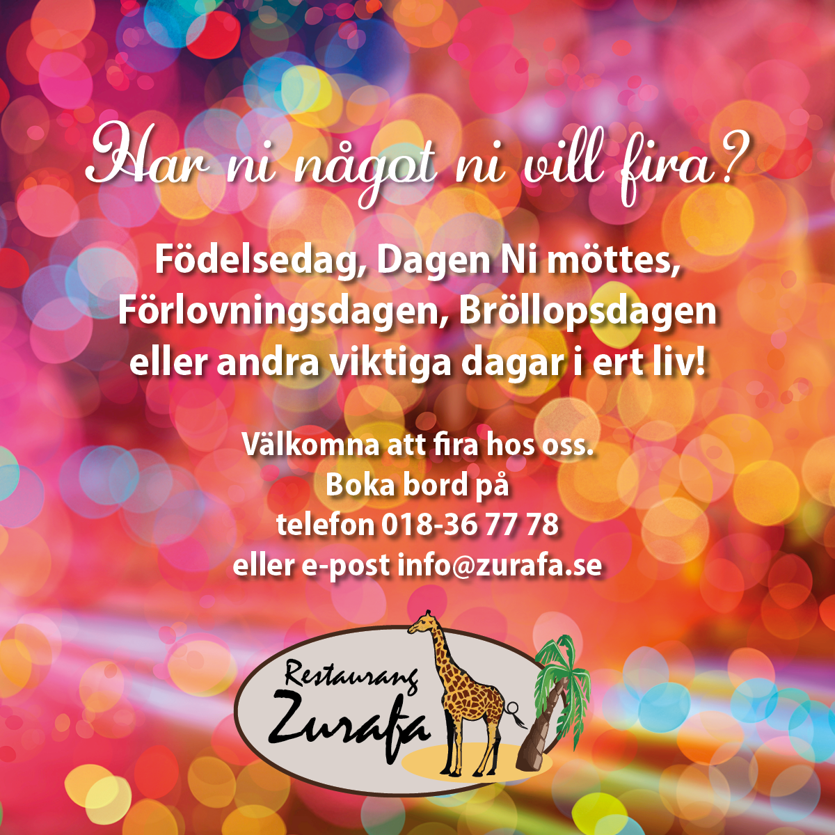 Så kom och besök oss för en matupplevelse utöver det vanliga. Luta dig tillbaka, njut av vår fantastiska mat, och se dina barn skratta och leka på vår lekplats. Vi ser fram emot att välkomna hela din familj och göra er vistelse hos oss oförglömlig. Välkommen till restaurang Zurafa utanför Uppsala!